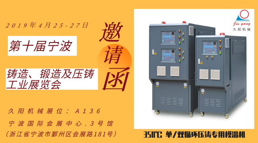 銷售熱線:13923865819 服務承諾2019第十屆寧波鑄造、鍛造及壓鑄工業(yè)展覽會將于4月25日~27日在寧波國際會展中心3號館隆重舉行。作為浙江省唯一的鑄造行業(yè)盛會,本次展會共有國內(nèi)180多家展商展示最新的技術(shù)和設(shè)備,展覽面積近1萬平方米,達歷史最高水平。深圳市久陽機械設(shè)備有限公司作為壓鑄行業(yè)知名模溫機廠家…
